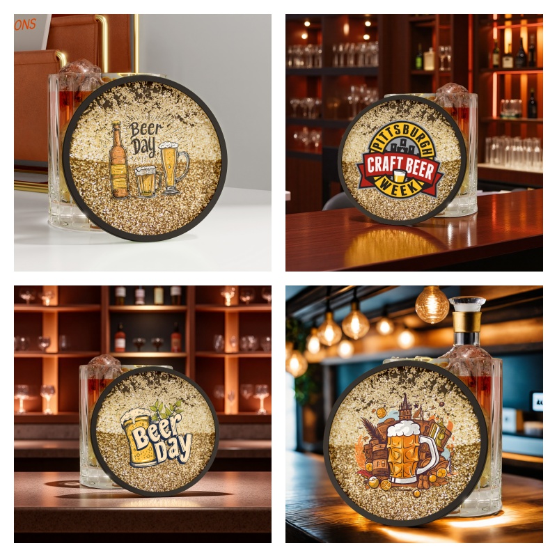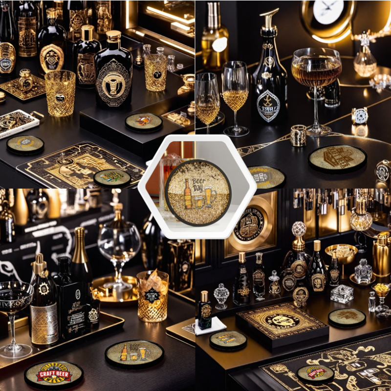 A slightly tipsy bar themed quicksand coaster, with desert golden quicksand blooming at the bottom of the cup, presenting a hazy light and shadow with the placement of drinks, allowing home drinks to instantly immerse themselves in the bar atmosphere.