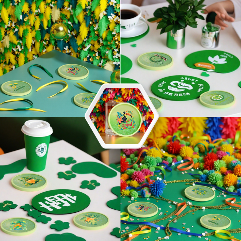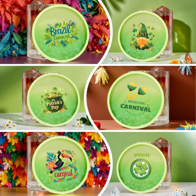 Carnival&St. Patrick's Day Limited Edition, customizable round acrylic quicksand coasters with colorful feathers interwoven with lucky clover, shimmering with party light from flowing fine sand, collision of joy and luck, making every moment full of festive magic